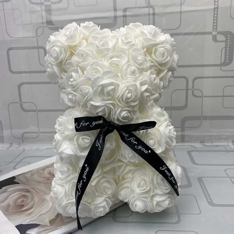 Ce petit nounours en peluche de 25 cm satisfera les petits et les grands grâce à sa couleur et son magnifique design. Il est fait de roses blanches artificielles, ce qui embellit encore plus son design. Sa couleur blanche signifie la pureté et la propreté de l’amour. De plus, il dispose d’une petite écharpe sous forme de nœud qui le rend mignon et attirant. C’est un jouet adorable pour les enfants. Si vous souhaitez les impressionner davantage, vous pouvez plutôt choisir ce teddy bear géant rose.