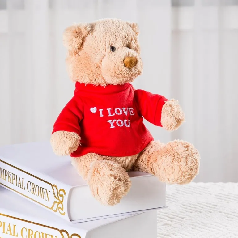 Ce bel ourson est ultra doux avec un visage amical, super séduisant. Il est habillé d’un t-shirt rouge amovible et de qualité supérieure avec le message « I love you » brodé devant.